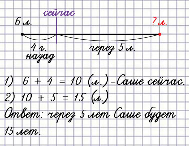6. Четыре года назад Саше было 6 лет. Сколько лет будет Саше через 5 лет?