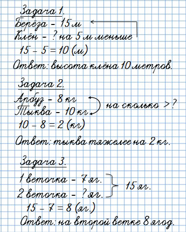 1) Высота берёзы 15 м, а клёна на 5 м меньше. Найди высоту клёна.