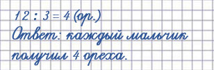 4. Коля разделил 12 орехов поровну — себе и двум своим друзьям. Сколько орехов получил каждый?