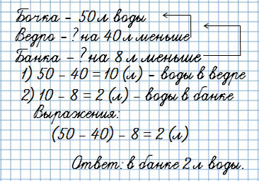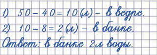 5. В бочке 50 л воды, в ведре на 40 л меньше, чем в бочке, а в банке на 8 л меньше, чем в ведре. Сколько литров воды в банке?