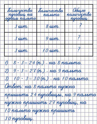 2. На каждое детское пальто пришивают 3 пуговицы. Сколько пуговиц нужно пришить на 8 таких пальто? на 9 пальто? на 10 пальто?