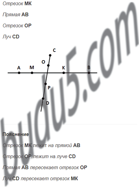 Начертите луч CD, прямую АВ и отрезки МК и ОР так, чтобы отрезок МК лежал на прямой АВ, отрезок ОР — на луче CD и чтобы прямая АВ пересекала отрезок ОР, а луч CD — отрезок МК.