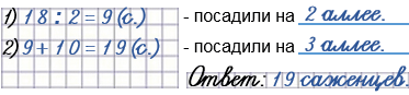 144. На первой аллее парка посадили 18 саженцев, на второй - в 2 раза меньше, чем на первой, а на третьей - на 10 саженцев больше, чем на второй. Сколько саженцев посадили на третьей аллее?