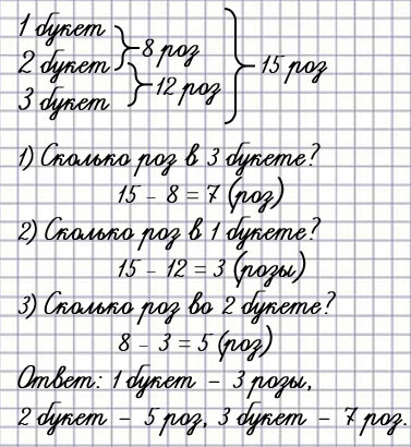 36. В трёх букетах всего 15 роз. В первом и во втором вместе 8 роз, а во втором и в третьем вместе 12 роз. Сколько роз в каждом букете?