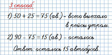 2. В автобусном парке было 90 автобусов. Утром выехало в рейсы 50 больших автобусов и 25 маленьких. Сколько автобусов осталось в парке?
