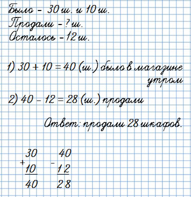 3. Утром в магазине было 30 шкафов для книг и 10 шкафов для одежды. К концу дня осталось 12 шкафов. Сколько шкафов продали за день?