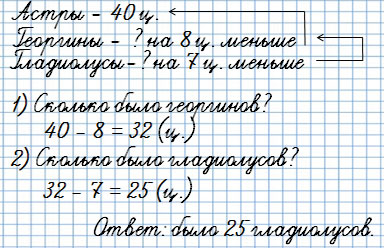 У бабушки в саду росли 40 астр, георгинов на 8 меньше, чем астр, а гладиолусов на 7 меньше, чем георгинов. Объясни, что обозначает выражение: