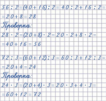 | 56 : 2 = 28 Проверка 28 • 2 = 56 | 72 : 3 = 24 Проверка 24 • 3 = 72 |