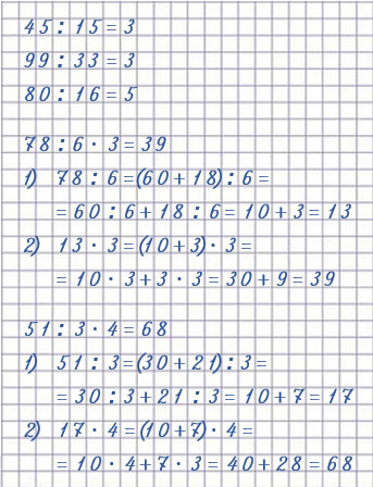 | 51 : 3 • 4 = (30 + 21) : 3 • 4 = (10 + 7) • 4 = 40 + 28 = 68 | 100 - 3 • 18 = 100 - 3 • (10 + 8) = 100 - (30 + 24) = 100 - 54 = 46 |