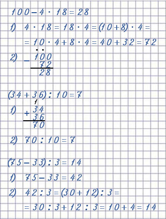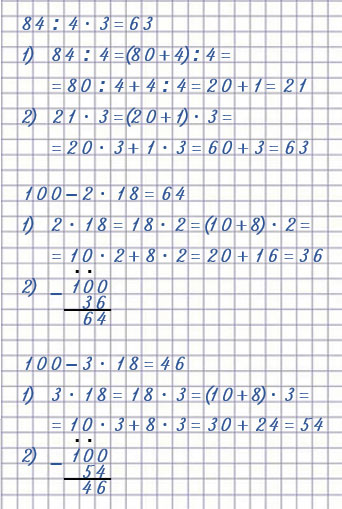 | 84 : 4 • 3 = (80 + 4) : 4 • 3 = (20 + 1) • 3 = 60 + 3 = 63 | 100 - 4 • 18 = 100 - 4 • (10 + 8) = 100 - (40 + 32) = 100 - 72 = 28 |