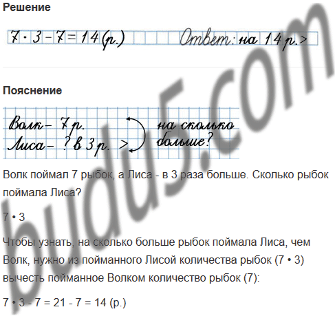 19. Волк и Лиса ловили рыбу. Волк поймал 7 рыбок, а Лиса - в 3 раза больше. На сколько больше рыбок поймала Лиса, чем Волк?