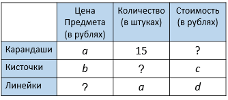 а + b + d : а (р.) - стоимость карандаша, кисточки и линейки.