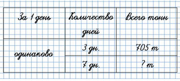 За 3 дня было выпечено 705 т хлеба. Вычислим, сколько тонн хлеба было выпечено за 1 день: