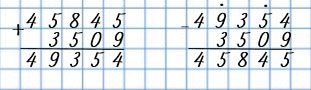 Пишу (единицы под единицами, десятки под десятками, сотни под сотнями, единицы тысяч под единицами тысяч, десятки тысяч под десятками тысяч, сотни тысяч под сотнями тысяч): 45 845 + 3 509.