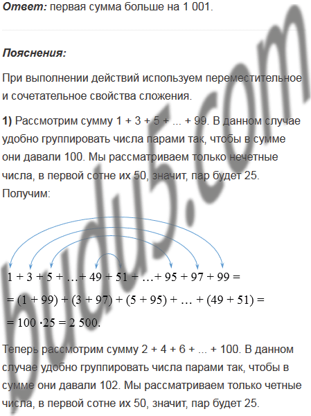 1) На сколько сумма 1 + 3 + 5 + ... + 99 меньше, чем сумма 2 + 4 + 6 + ... + 100?