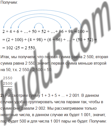 2) Какая из сумм 1 + 3 + 5 + ... + 2 001 и 2 + 4 + 6 + ... + 2 000 больше и на сколько?