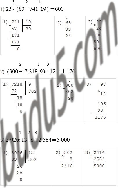 1) 25(63 - 741 :19); 3) 3 926 : 138 + 2 584;