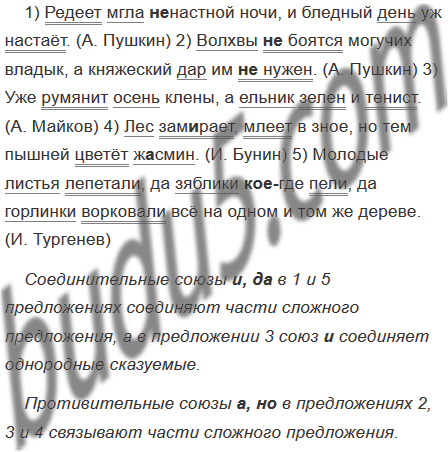 1) Редеет мгла (не) настной ночи и бледный день уж настаёт. (А. Пушкин) 2) Волхвы (не) боятся могучих владык а княжеский дар им (не) нужен. (А. Пушкин) 3) Уже румянит осень клены а ельник зелен и тенист. (А. Майков) 4) Лес зам..рает млеет в зное но тем пышней цветёт ж..смин. (И. Бунин) 5) Молодые листья лепетали да зяблики (кое) где пели да горлинки ворковали всё на одном и том же дереве. (И. Тургенев)