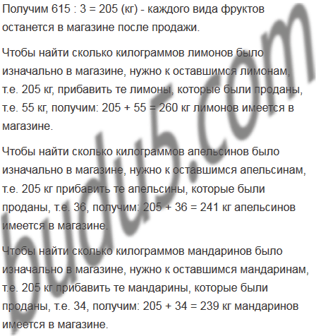 В магазине имеются лимоны, апельсины и мандарины, всего 740 кг. Если бы продали 55 кг лимонов, 36 кг апельсинов и 34 кг мандаринов, то оставшиеся массы лимонов, апельсинов и мандаринов оказались бы равными. Сколько килограммов фруктов каждого вида имеется в магазине?