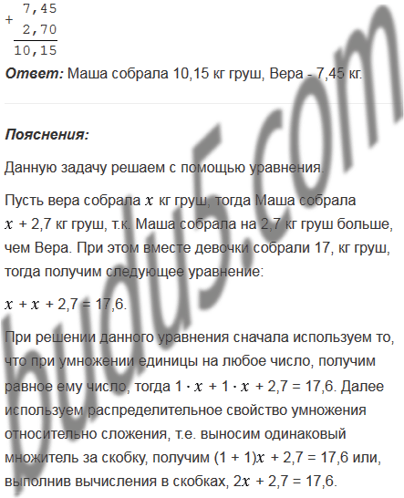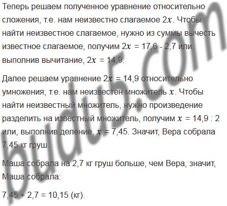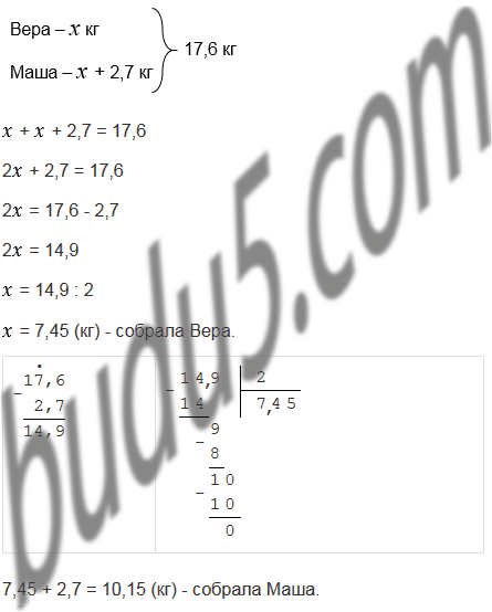 Маша и Вера собрали 17,6 кг груш, причем Маша собрала на 2,7 кг груш больше, чем Вера. Сколько килограммов груш собрала каждая девочка?