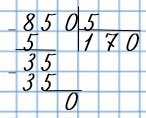 850 : 5 = 500 : 5 + 350 : 5 = 100 + 70 = 170
