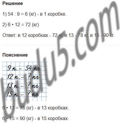 14. В девяти одинаковых по массе коробках 54 кг винограда. Сколько всего килограммов винограда, если таких коробок 12? 13? 15?