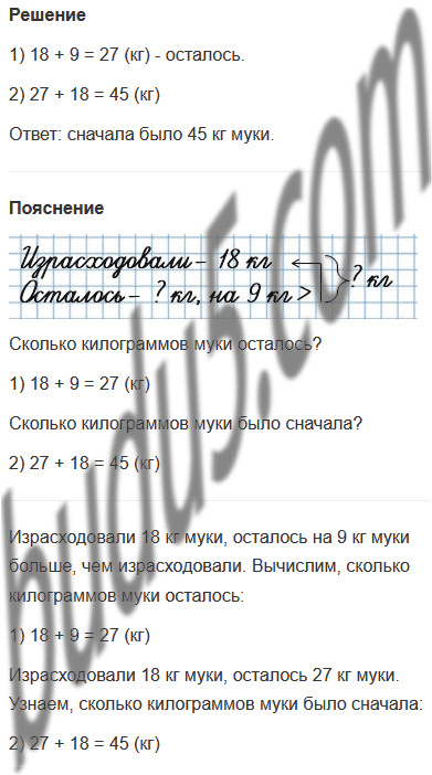 15. После того как в столовой израсходовали 18 кг муки, осталось на 9 кг муки больше, чем израсходовали. Сколько всего килограммов муки было в столовой сначала?