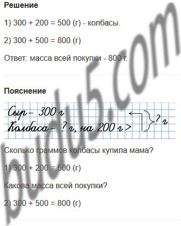 24. Мама купила 300 г сыра, а колбасы на 200 г больше, чем сыра. Узнай массу всей этой покупки.