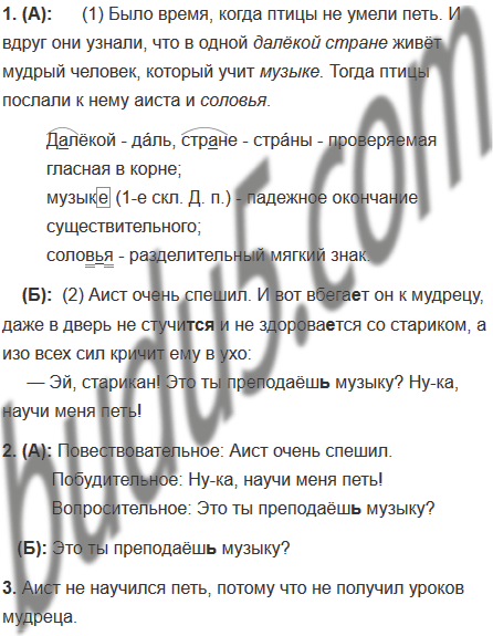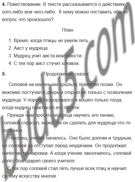 (1) Было время, когда птицы не умели петь. И вдруг они узнали, что в одной далёкой стране живёт мудрый человек, который учит музыке. Тогда итицы послали к нему аиста и соловья.