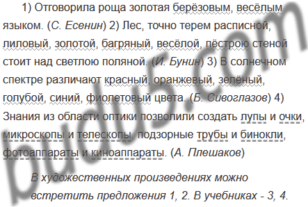 1) Отговорила роща золотая берёзовым, весёлым языком. (С. Есенин) 2) Лес, точно терем расписной, лиловый, золотой, багряный, весёлой, пёстрою стеной стоит над светлою поляной. (И. Бунин) 3) В солнечном спектре различают красный, оранжевый, зелёный, голубой, синий, фиолетовый цвета. (Б. Сивоглазов) 4) Знания из области оптики позволили создать лупы и очки, микроскопы и телескопы, подзорные трубы и бинокли, фотоаппараты и киноаппараты. (А. Плешаков)