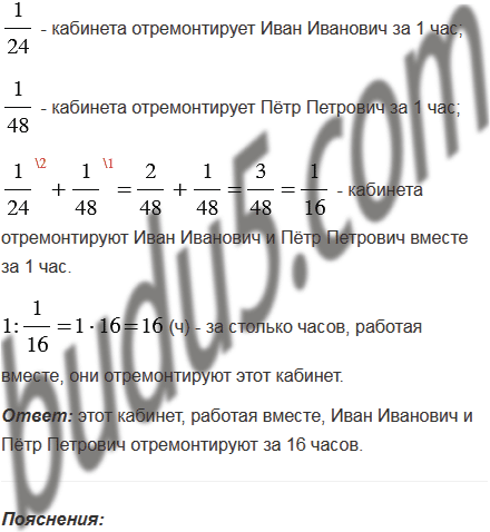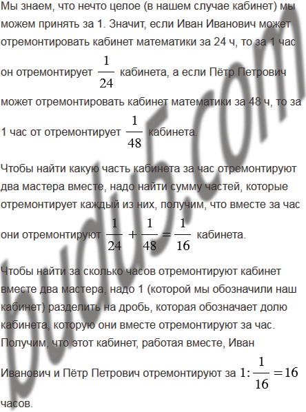 Мастер Иван Иванович может отремонтировать кабинет математики за 24 ч, а мастер Пётр Петрович - за 48 ч. За сколько часов, работая вместе, они отремонтируют этот кабинет?