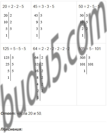 Из чисел 20, 45, 50, 125, 64, 505 выберите те, разложение которых на простые множители содержит только числа 2 и 5.