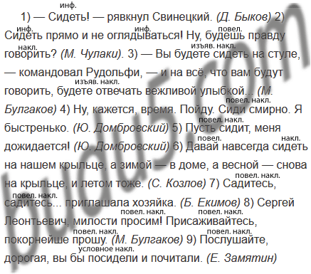 1) — Сидеть! — рявкнул Свинецкий. (Д. Быков) 2) Сидеть прямо и не оглядываться! Ну, будешь правду говорить? (М. Чулаки). 3) — Вы будете сидеть на стуле, — командовал Рудольфи, — и на всё, что вам будут говорить, будете отвечать вежливой улыбкой... (М. Булгаков) 4) Ну, кажется, время. Пойду. Сиди смирно. Я быстренько. (Ю. Домбровский) 5) Пусть сидит, меня дожидается! (Ю. Домбровский) 6) Давай навсегда сидеть на нашем крыльце, а зимой — в доме, а весной — снова на крыльце, и летом тоже. (С. Козлов) 7) Садитесь, садитесь... приглашала хозяйка. (Б. Екимов) 8) Сергей Леонтьевич, милости просим! Присаживайтесь, покорнейше прошу. (М. Булгаков) 9) Послушайте, дорогая, вы бы посидели и почитали. (Е. Замятин)