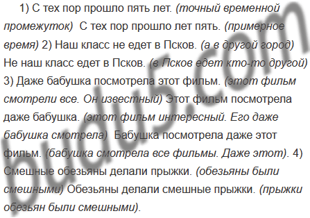 1) С тех пор прошло пять лет. С тех пор прошло лет пять. 2) Наш класс не едет в Псков. Не наш класс едет в Псков. 3) Даже бабушка посмотрела этот фильм. Этот фильм посмотрела даже бабушка. Бабушка посмотрела даже этот фильм. 4) Смешные обезьяны делали прыжки. Обезьяны делали смешные прыжки.