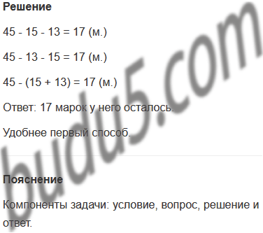 "У Дениса было 45 марок. Он подарил Пете 15 марок, а Коле - 13 марок. Сколько марок у него осталось?"