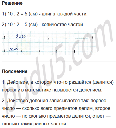 Задание № 3. Раздели отрезок длиной 10 см сначала на 2 равные части, а затем - на равные части по 2 см в каждой. Сделай рисунки и запиши равенства.