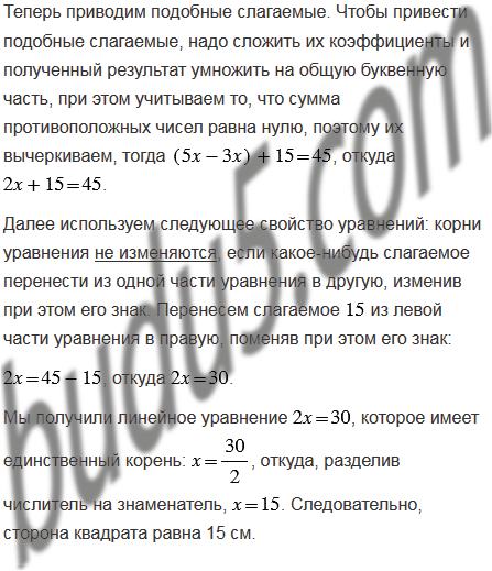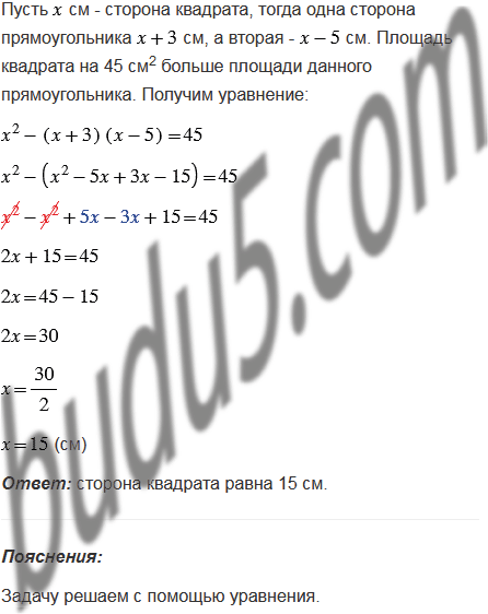 Сторона квадрата на 3 см меньше одной из сторон прямоугольника и на 5 см больше его другой стороны. Найдите сторону квадрата, если его площадь на 45 см2 больше площади данного прямоугольника.