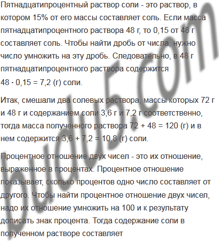 Смешали 72 г пятипроцентного раствора соли и 48 г пятнадцатипроцентного раствора соли. Найдите процентное содержание соли в полученном растворе.