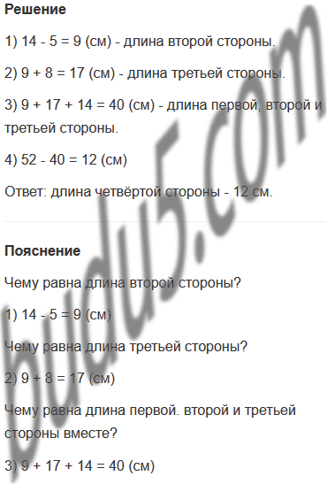 Задание № 14. Периметр четырёхугольника равен 52 см. Одна его сторона равна 14 см, вторая - на 5 см меньше первой, а третья - на 8 см больше второй. Чему равна длина его четвёртой стороны?