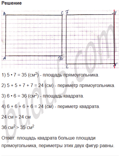 Задание № 15. Стороны прямоугольника равны 5 см и 7 см, а сторона квадрата - 6 см. Построй их, сравни их периметры и площади.