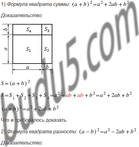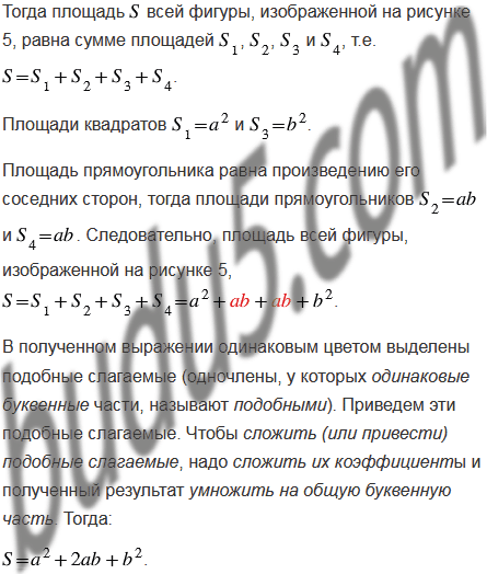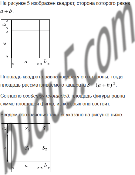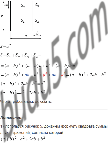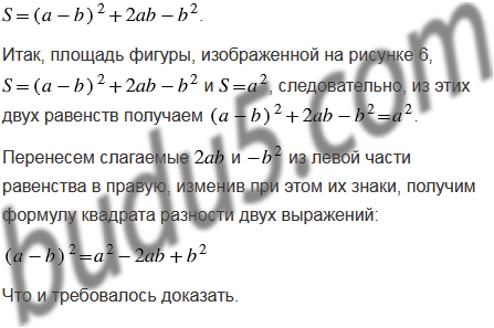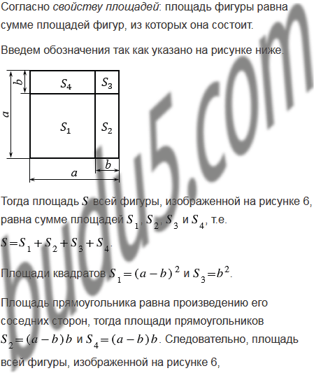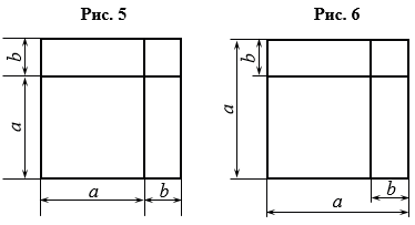 Древнегреческий ученый Евклид (III в. до н. э.) доказывал формулы квадрата суммы и квадрата разности геометрически. Пользуясь рисунками 5 и 6, восстановите его доказательство.