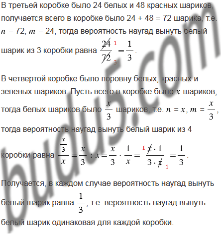 В первой коробке было 45 шариков, из них 15 - белых, во второй - 75 шариков, из них 25 - белых, в третьей - 24 белых и 48 красных шариков, а в четвертой - поровну белых, красных и зеленых шариков. Для какой коробки больше вероятность наугад вынуть из нее белый шарик?