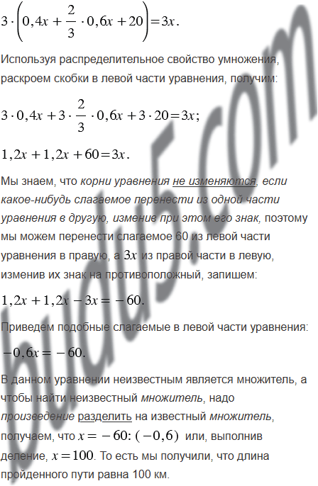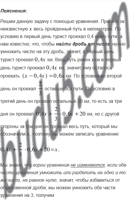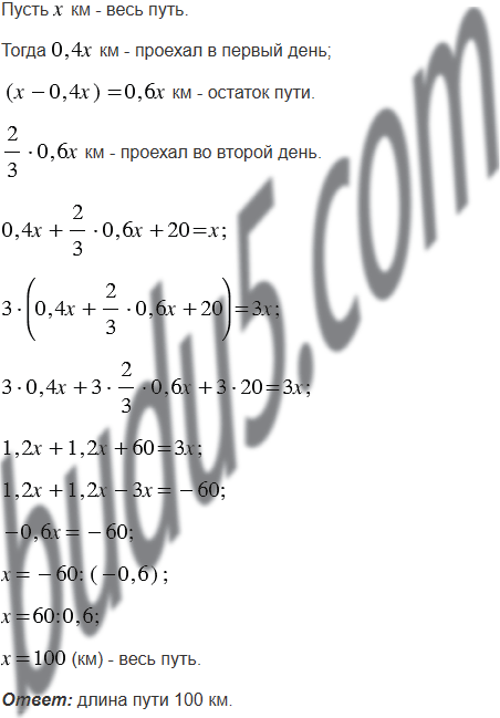 В первый день турист проехал 0,4 всего пути, во второй - оставшегося, а в третий - остальные 20 км. Найдите длину пути.