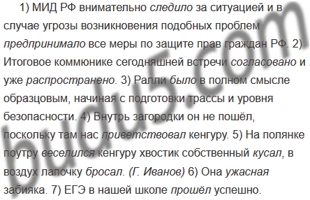 1) МИД РФ внимательно (следил, следило) за ситуацией и в случае угрозы возникновения подобных проблем (предпринимал, предпринимало) все меры по защите прав граждан РФ. 2) Итоговое коммюнике сегодняшней встречи (согласован, согласовано) и уже (распространён, распространено). 3) Ралли (был, было) в полном смысле образцовым, начиная с подготовки трассы и уровня безопасности. 4) Внутрь загородки он не пошёл, поскольку там нас (приветствовал, приветствовала) кенгуру. 5) На полянке поутру (веселилась, веселился) кенгуру хвостик собственный (кусал, кусала), в воздух лапочку (бросал, бросала). (Г. Иванов) 6) Она (ужасный, ужасная) забияка. 7) ЕГЭ в нашей школе (прошёл, прошло) успешно.