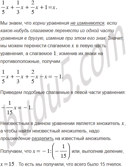 (Задача Бхаскары.) Есть кадамба цветок: на один лепесток пчёлок пятая часть села. Рядом росла вся в цвету симендга, и на ней третья часть разместилась. Разность их ты найди, затем трижды её сложи, на кумай этих пчёл посади. Только пчёлка одна не нашла себе места нигде, всё летала туда и сюда, запахом цветов наслаждалась. И скажи мне теперь, сколько пчёлок всего здесь собралось?