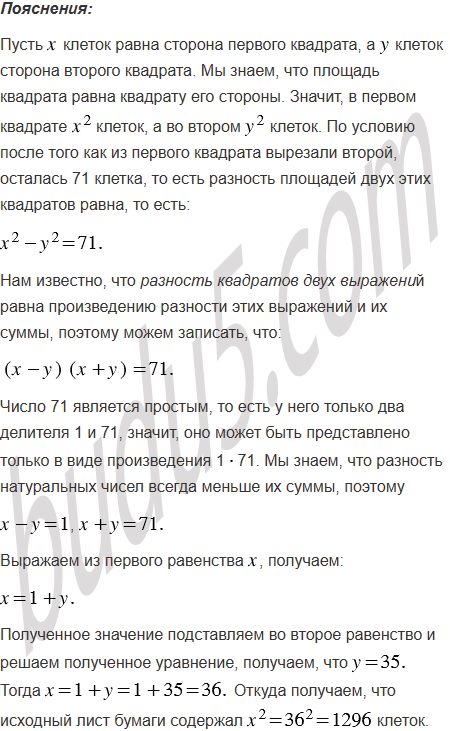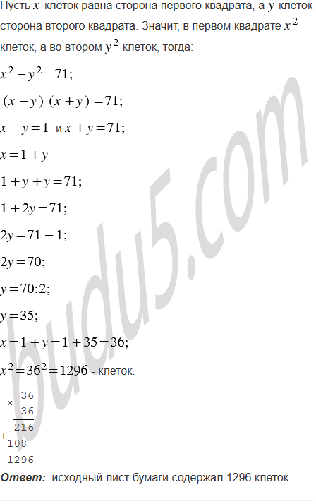 Из квадратного листа бумаги в клетку, содержащего целое количество клеток, вырезали по линиям квадрат, содержащий целое количество клеток, так, что осталась 71 клетка. Сколько клеток содержал исходный лист бумаги?