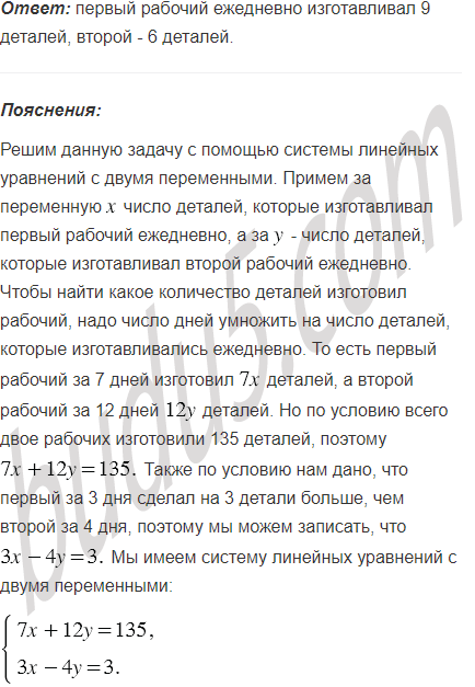 Двое рабочих изготовили 135 деталей. Первый рабочий работал 7 дней, а второй - 12 дней. Сколько деталей изготавливал ежедневно каждый рабочий, если первый за 3 дня сделал на 3 детали больше, чем второй за 4 дня?