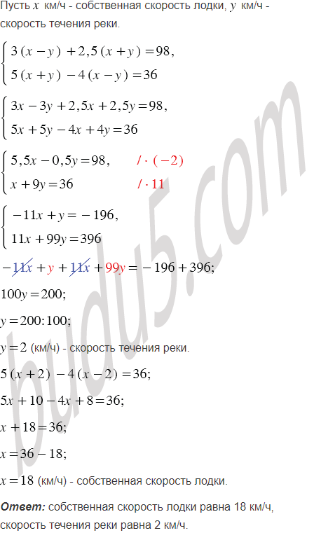 Моторная лодка за 3 ч движения против течения реки и 2,5 ч по течению проходит 98 км. Найдите собственную скорость лодки и скорость течения, если за 5 ч движения по течению она проходит на 36 км больше, чем за 4 ч против течения реки.