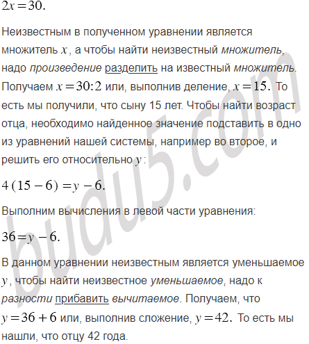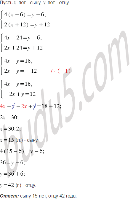 Сын 6 лет тому назад был в 4 раза младше отца, а через 12 лет он будет младше отца в 2 раза. Сколько лет отцу и сколько - сыну?