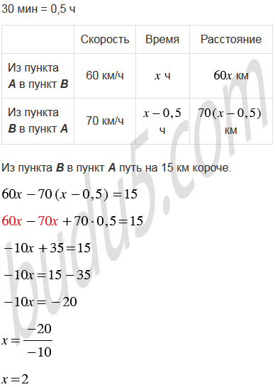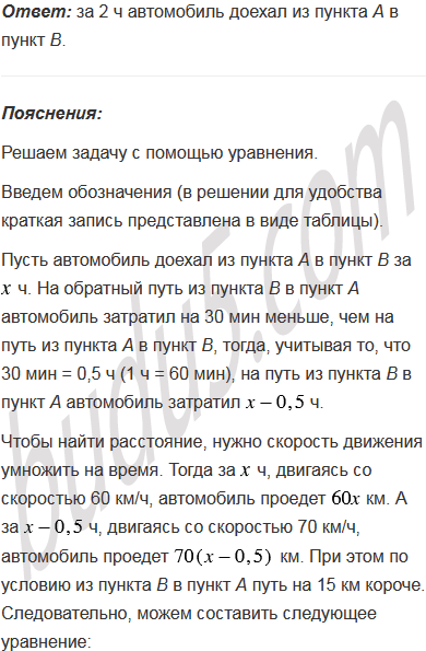 Из пункта А в пункт В автомобиль ехал со скоростью 60 км/ч, а возвращался из пункта В в пункт А со скоростью 70 км/ч другой дорогой, которая на 15 км короче первой. На обратный путь автомобиль затратил на 30 мин меньше, чем на путь из пункта А в пункт В. За какое время он доехал из пункта А в пункт В?